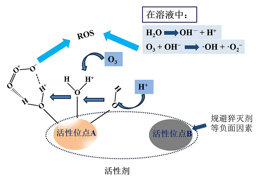 臭氧的氧化还原电位为2.07V,是一种极强的氧化剂,氧化还原电位仅次于氟。在水溶液中臭氧可以对有机物进行高效氧化,氧化作用包括两种途径:一种是臭氧对有机物的直接氧化;另一种是臭氧分解产生羟基自由基(·OH)后对有机物的间接自由基氧化反应。
